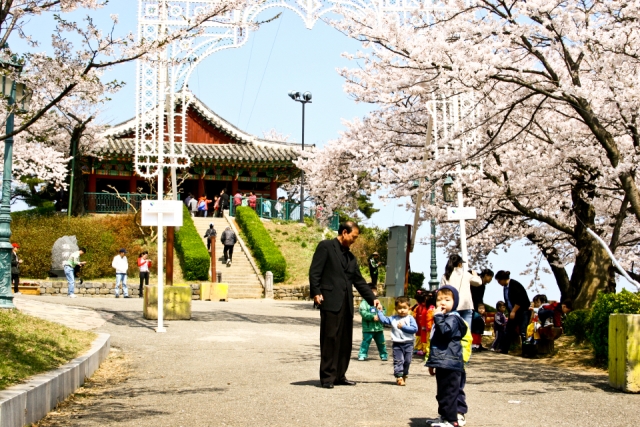경포대 정원의 벚꽃도 활짝 피어 찾는 이를 반기고 정자에서 아래를 내려다보면 온통 꽃으로 뒤덮인 벚나무의 도열이 더욱 멋지다.