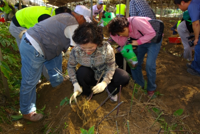 트렉터를 이용하여 인삼을 캐는 요즘이지만, 이처럼 인삼 캐기 체험이 있는 때에는 옛 방식 그대로 2개의 갈고리 모양으로 된 곡괭이를 이용한다.