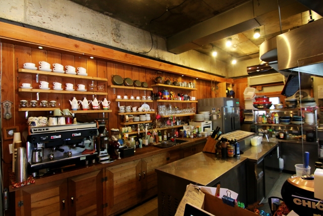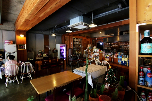 은은한 분위기, 무게감 있고 편안한 느낌의 목조 인테리어. 홍스쿡샵의 독특한 느낌이 살아있는 내부의 풍경입니다.