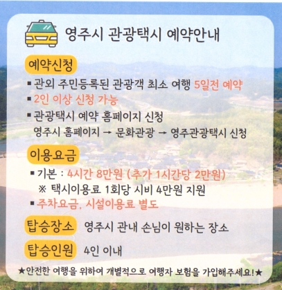 영주시에서 4만원까지 지원하는 택시관광은 영주시 홈페이지에서 먼저 예약하신 후 기차나 버스를 타고 영주역과 버스터미널에 내리면서부터 편리하고 행복한 안전여행을 책임집니다.