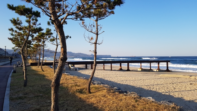 고풍스러운 한옥과 여유로운 바다 풍경이 하나가 되어 어우러지고 해변가를 따라 심어진 소나무는 한옥에서 바라보는 바닷가 풍경을 더욱 운치있게 만든다.