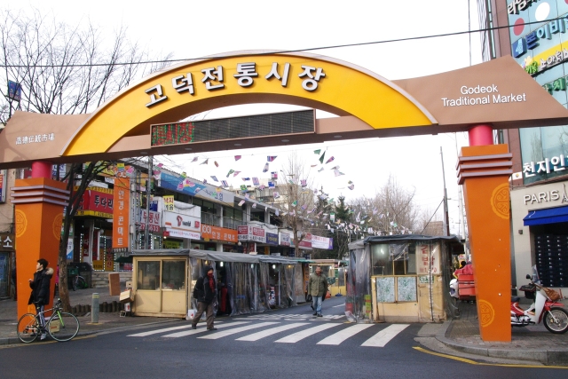 상일동역 2번 출구로 나오면 활기찬 시장의 기운이 퍼져 나오는 것을 느낄 수 있습니다. 오늘날에는 보기 힘든 전통시장의 면모를 잘 간직하고 있는 이곳은 바로 고덕전통시장인데요, 다른 시장과 다르게 모든 노점상들이 같은 크기의 공간을 정해놓고 판매를 하고 있어 깔끔하고 질서 정연한 모습이 인상적입니다. 그래서 이동하는데 어려움 없이 편하게 시장을 구경하고 물건을 구매할 수 있답니다.