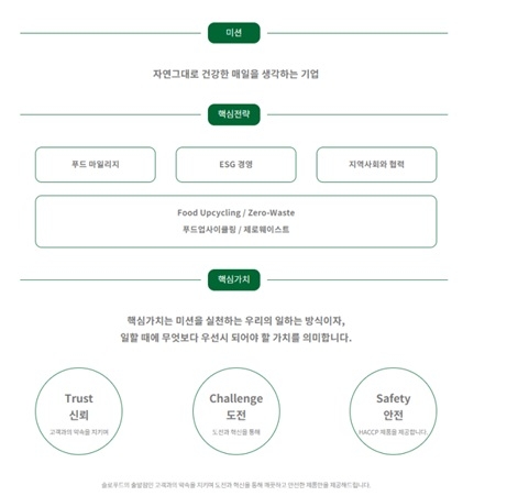 2010년 7월에 설립하여 2013년 3월 가공공장 신축, 2014년 FDA등록, 2015년 HACCP 인증, 2016년 벤처기업 인증, 2017년 농공상융합형 중소기업 인증, 연구개발전담부서 인증, 20년 수출 유망 중소기업 지정, 21년 사회적기업, 기술혁신형 중소기업(Inno-Biz) 인증 등을 받으며 매년 성장하고 있는 회사로 지역에서 생산되는 농산물 계약 재배를 통하여 농가에는 소득의 안정을 보장하고 기업은 안정적인 공급을 통해 제품을 꾸준히 생산 가능한 시스템을 체계를 구축하고 있습니다.