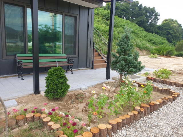 각 객실의 프라이빗한 공간을 위한 개별바베큐장과 아이들이 마음껏 뛰어놀수 있는 탁트인 자연놀이터와 편한게 앉아 식물을 보며 휴식을 취할수 있는 벤치를 정원 곳곳에 배치하였습니다.