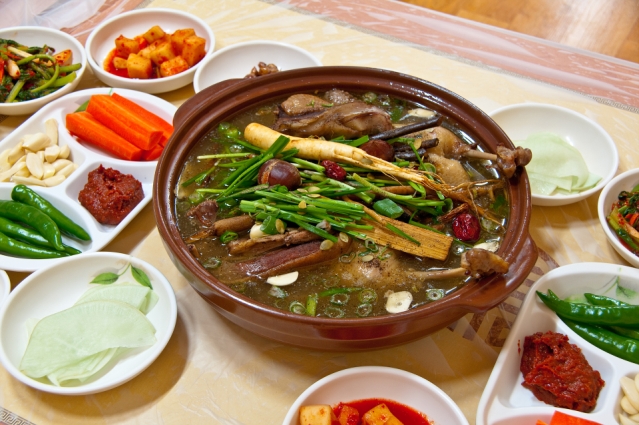 인삼, 대추, 황기, 오가피 등의 10가지 한방약초와 함께 푹 우려내어 오리자체의 누린내가 전혀 느껴지지 않으며 4~5가지 기본반찬과 함께 나와 음식의 풍미를 더해준다.
